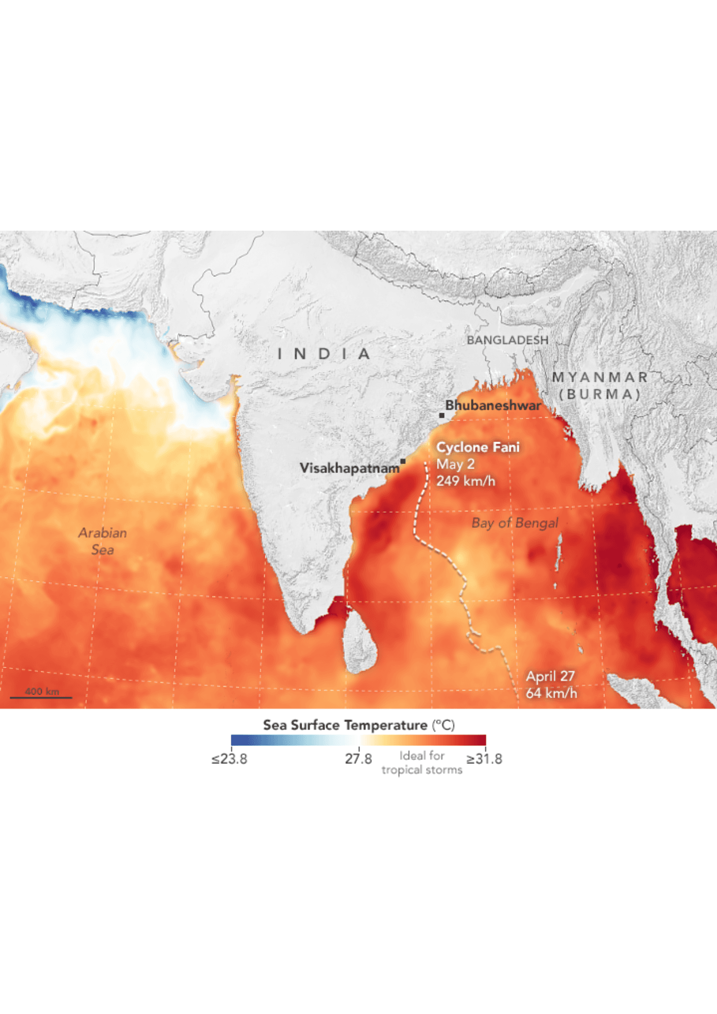 A map showing the path & development of Cyclone Fani with the sea surface temperature and wind speeds