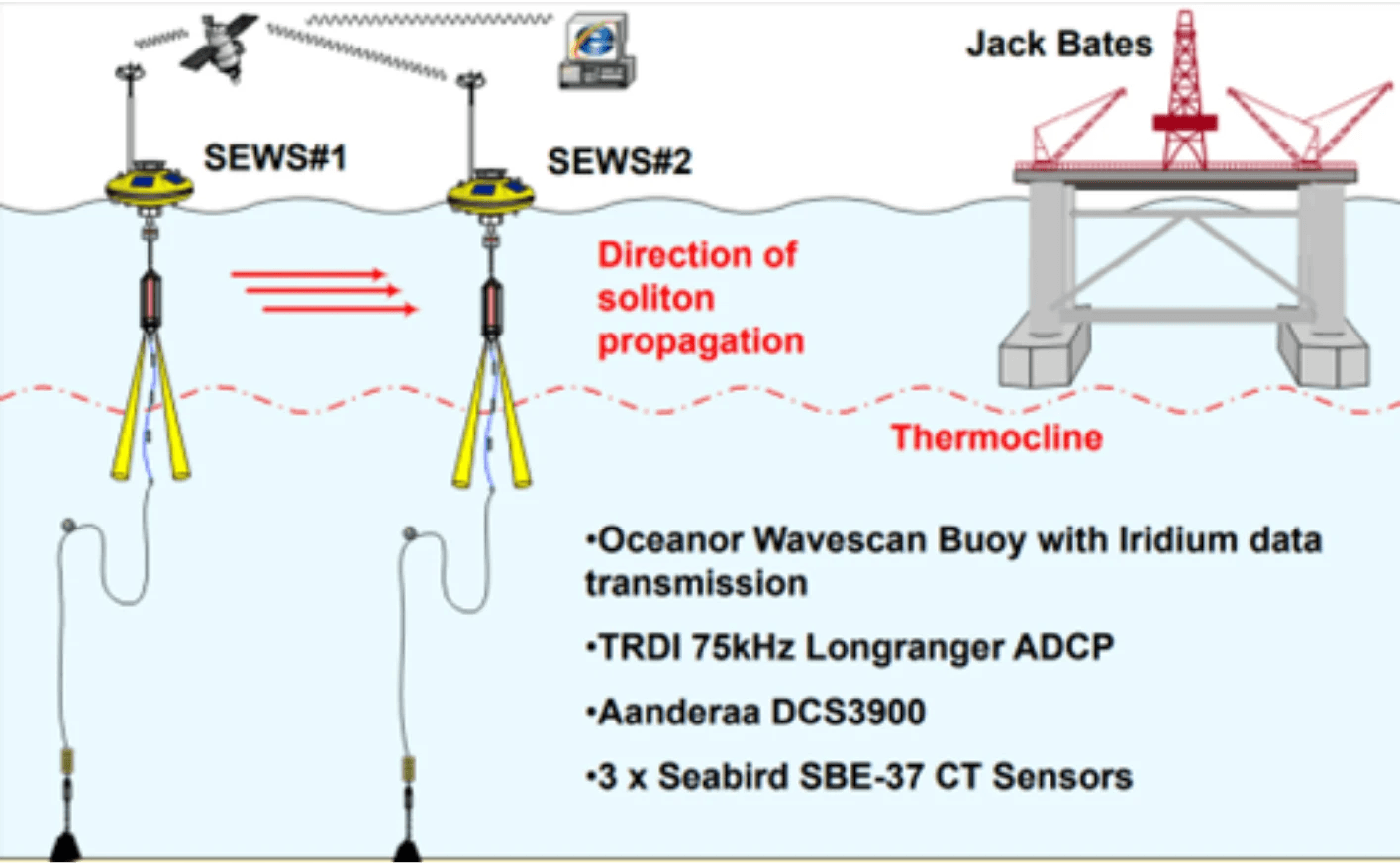 Deployed two SEWS moorings equipped with advanced oceanographic sensors between the soliton generation zone and the drill site to track soliton movement in real time.